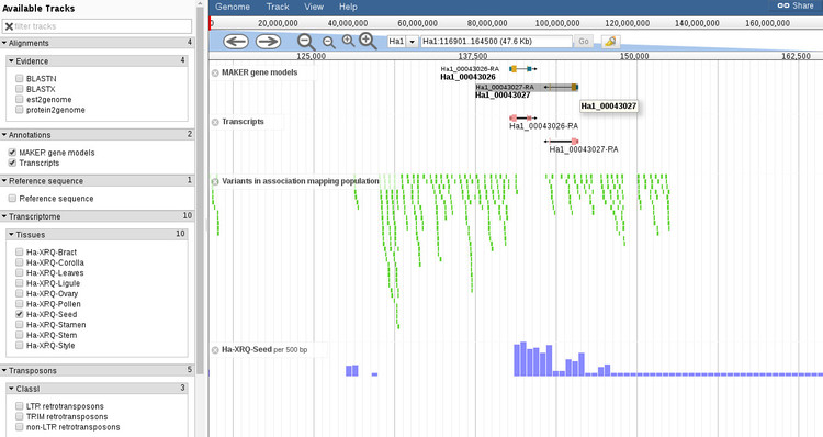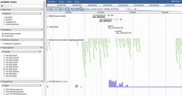 This guide will give you a brief overview of how to use JBrowse for exploring the sunflower genome annotations. For reference, there is a more detailed guide for how to use JBrowse on ARAPORT (Arabidopsis Information Portal). This page serves to explain some of the features of the sunflower browser that might not be found on other sites.