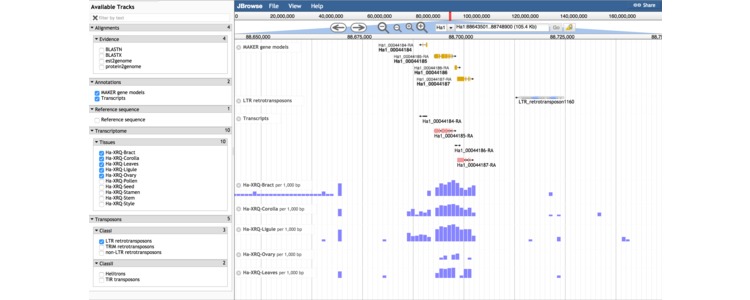 Annotation of the sunflower genome has been a collaborative effort of researchers from INRA and UBC, and these efforts have resulted in the development of novel annotation software. Our approach, described briefly under the activities tab, relies on annotating and masking the repetitive fraction of the genome prior to annotating the gene space. The gene and transposon sequences, and the functional annotations, are available for download, viewing in the genome browser, and researchers may also perform a sequence-based search of the genome searching through the web-based BLAST tool which links results to the genome browser.